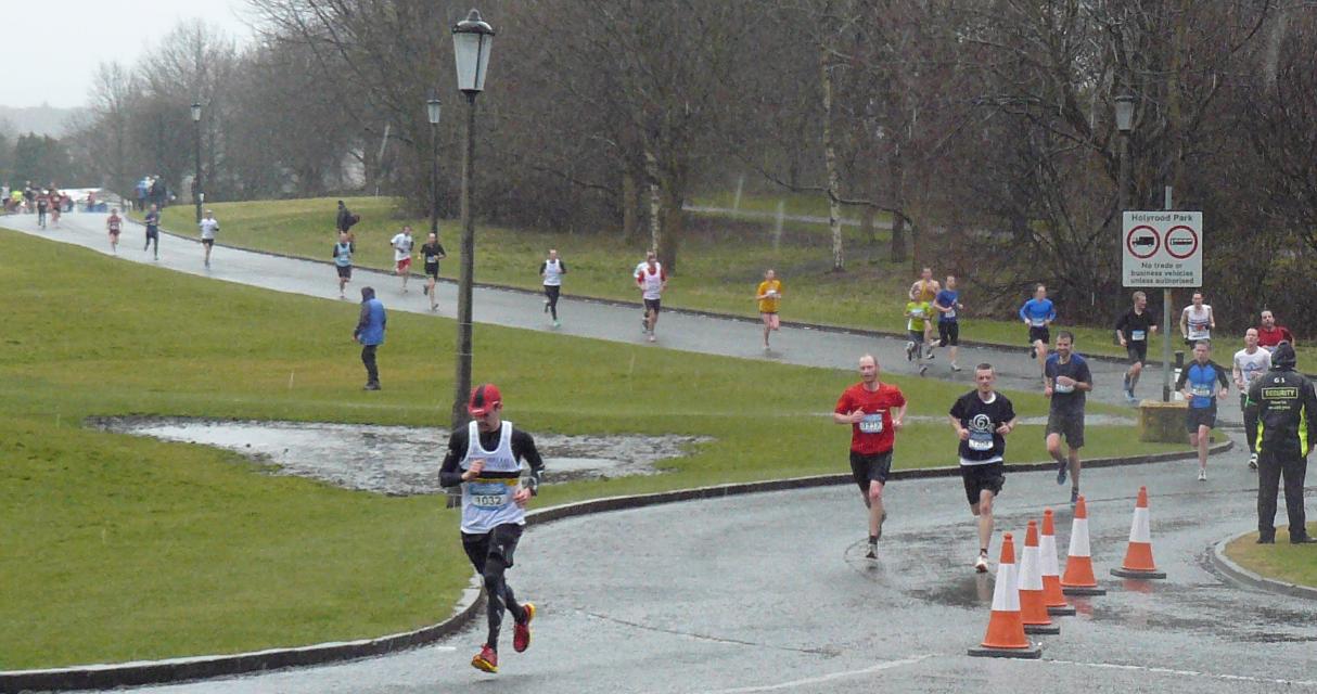 After a few kilometre trundle along Portobello beachfront (which is much nicer without the wind!), you start the long (and slow, although this might have just been my body fighting back from the fast first 5km) slog uphill through Portobello (where not much happened apart from seeing an old lady and her (grand?)son sat looking miserable under covers but cheering everyone on by banging wooden spoons on their pots), then Duddingston – running past the Duddingston Kirk (which has been there since 1124!) and the Sheep’s Heid Inn (which has apparently been serving kilted patrons since 1360 – those 236 sober years must have been tough…) and up to Pollock Halls next to Arthur’s Seat. By this point, your face looks it’s been mummified by the wind and the only thing which keeps you going is the knowledge that the next 2km are on a steep downhill road which takes you to the Parliament.