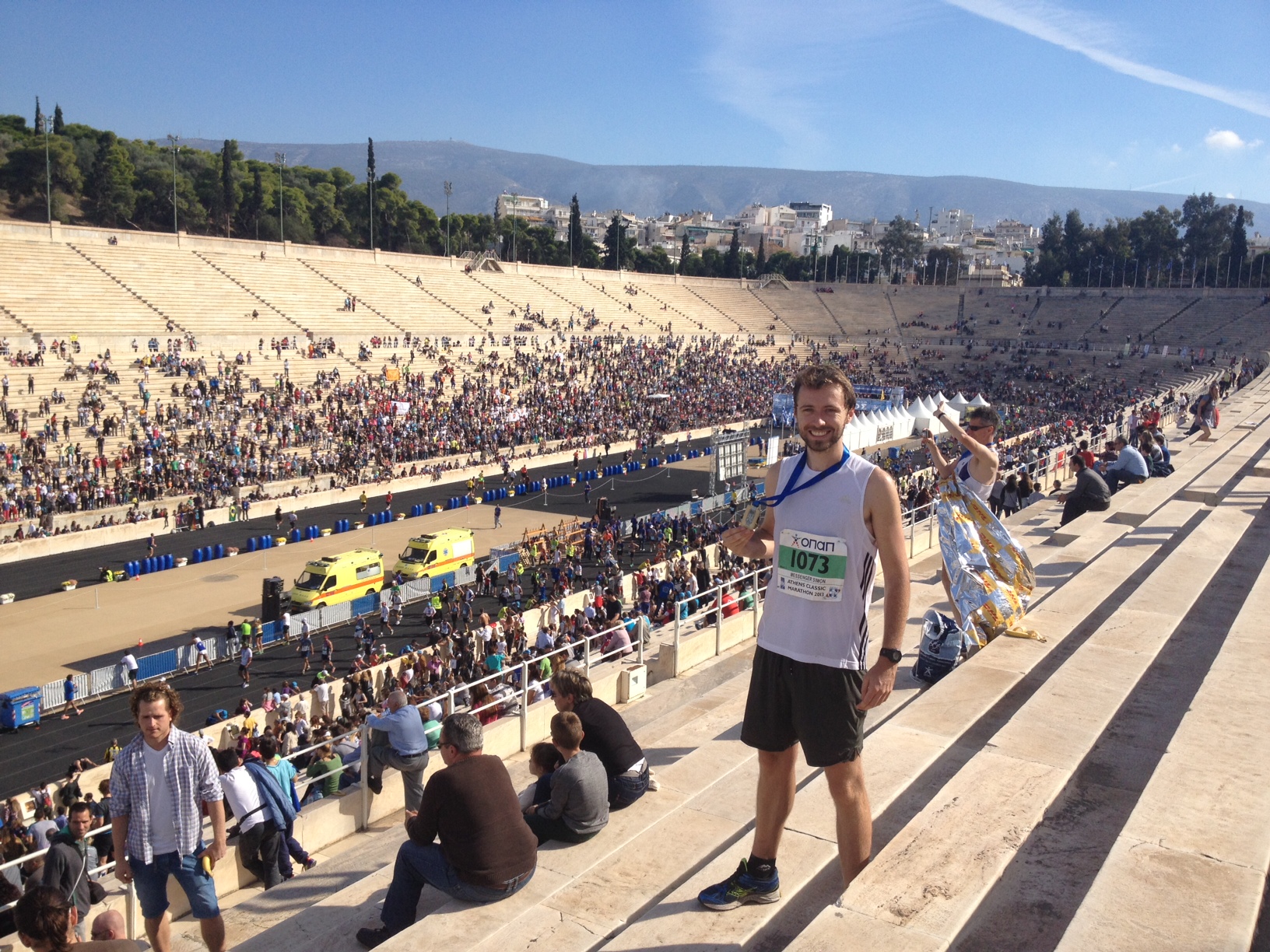 The last 500m were very much downhill (yay!) and the roads were increasingly lined by people which was appreciated to say the least. Then, with 200m to go, you get your first sight of the Panathinaiko stadium, the hairpin-shaped 45,000 seater stadium which hosted the first modern Olympic Games. Admittedly, there weren’t 45,000 shrieking Athenian goddesses filling the stadium as in 1896 but there were probably a good 5,000 family members which gave it a great atmosphere and stimulated you (well, me) to bomb down the final straight with a definite sense of achievement.