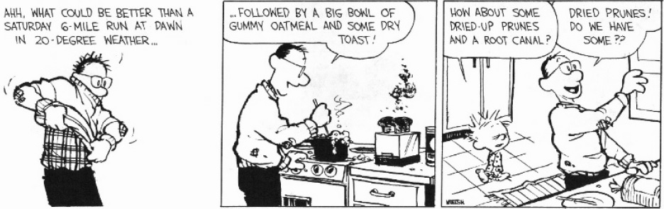 Just before a big storm drew in, we wheezed our way to the end and I grabbed a £1 taxi back home for a healthy breakfast: a 5.15am rise for 10 mile run followed by carrot and orange juice, I’m starting to resemble Calvin’s Dad in Calvin & Hobbes!