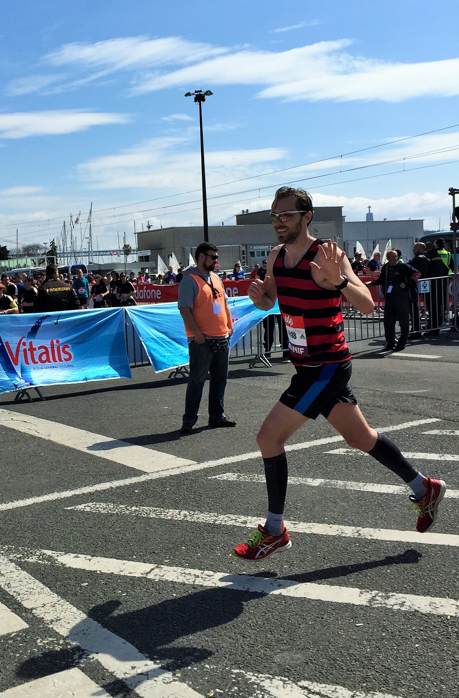 Finally, we set off under beaming sunshine and the watchful look of Lisbon’s 80m high replica of Rio de Janeiro’s Christ the King statue. By that point, I wouldn’t have been surprised to look up and see tears pour down his face because of the event’s organisation. My legs were stiff as wood from standing still for so long and my stomach was rumbling a little from hunger and not from the usual nerves but that was me off.