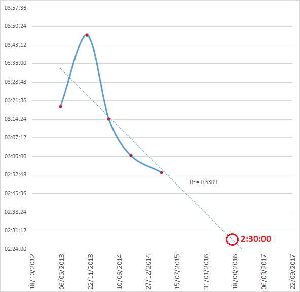 So, based on this complex analysis which looks at how my marathon times have improved since I started running, I’m due to break the 2:30 mark in…November of this year!! Oops. No pressure then…