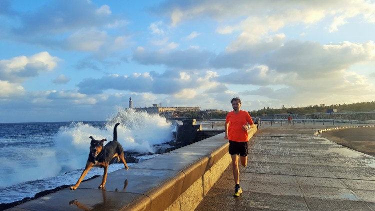 While free of cars, the Malecon did have one quite major obstacle: the ocean and its raging waves. Without fail, every unsuspecting tourist will get a soaking and I regularly found myself jumping into the road to avoid getting wet. The dog – by now named Spot for a distinctive mark on his coat – was far braver than me and excitedly sprinted along the seawall and, after quite a few days of slow running, my pace was good and the city flashed by.