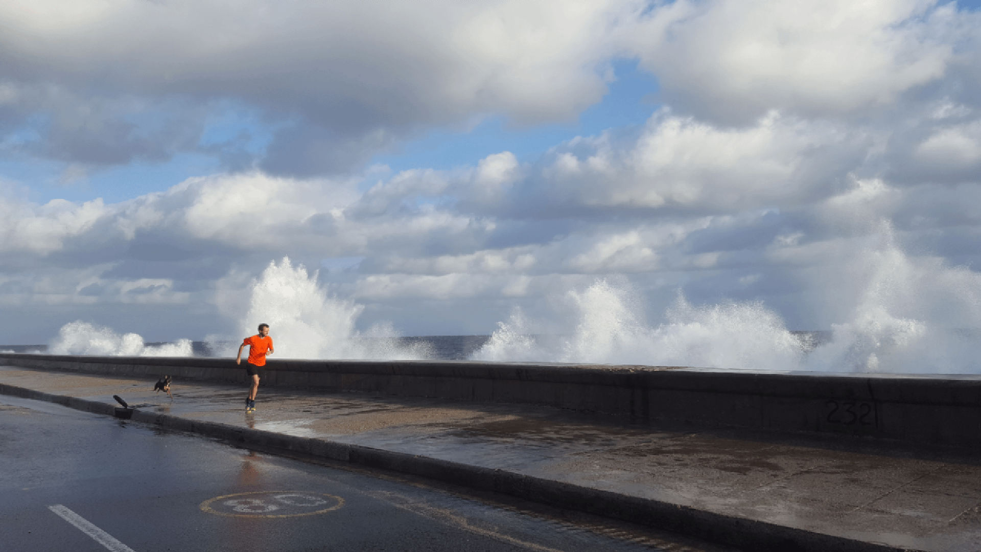 A few locals ran by and all, without exception, were running in the road. Did they know something that I don’t? In short, yes. Moments later, a wave no less than three meters high came crashing over the wall – itself three or four meters high. I spun sideways just in time to avoid being knocked over and braced for impact. Spot and I emerged, somewhat drenched, and caught our breath while, in the distance, three workmen were bent double laughing.