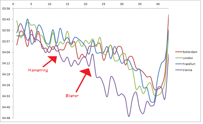 At the back of my mind, I was also thinking “well, a very minor and totally-not-deadly infection WOULD be a good excuse to underperform”. That sort of thinking probably says a lot about my mindset heading into this race: I’d run many more kilometres in training than I normally do (100km/week instead of 60-70km) but my warm-up race performances were atrocious and I just couldn’t shake off a chronic hamstring injury. My confidence was abysmally low but I hoped that the extra mileage would at least pull me through the later kilometres. I’d done no altitude training, hardly any hills, less cycling and stretching/yoga than I used to do but I’d done 27 runs over 15kms in the previous 3 months compared to 9 in the 3 months before Frankfurt (my PB). Would this help? (nope)