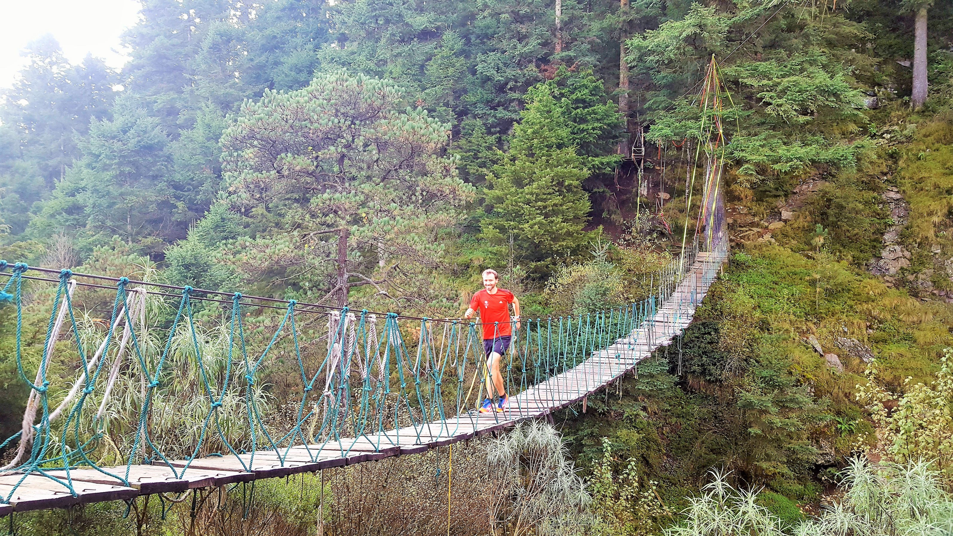 Almost immediately, we reached a mouldy rope-ladder bridge. ‘Decrepit’ barely did it justice: one side had no hand rail support left, the first 4 beams were missing and the rest were either mouldy, thinning or missing too. Because we were adventurous/stupid, we stopped running briefly and took a few photos to pretend we were running across it while holding veeery tightly onto the handrail before heading up a different path. [However, as we’d discover later, the return journey would force us to very very gingerly cross the river using that bridge. One. At. A. Time. Please.]