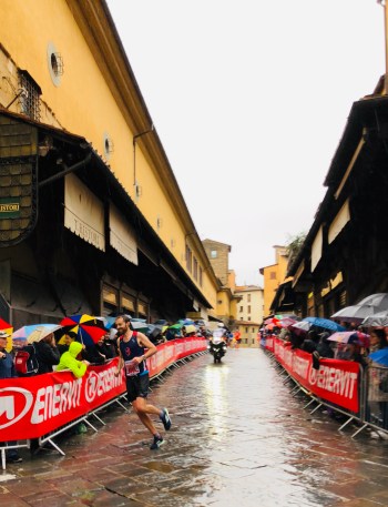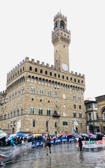 We hopped over the river Arno a few times though I think it was exclusively designed to ensure we got to cross back over the Ponte Vecchio, the iconic bridge with jewellery shops/houses across it. Pippa was there to wave me on, once she’d fought her way past pushy locals! One last hop across the river and I crossed the halfway line in 1h22’06” which was pretty much bang on target with a few seconds to spare.