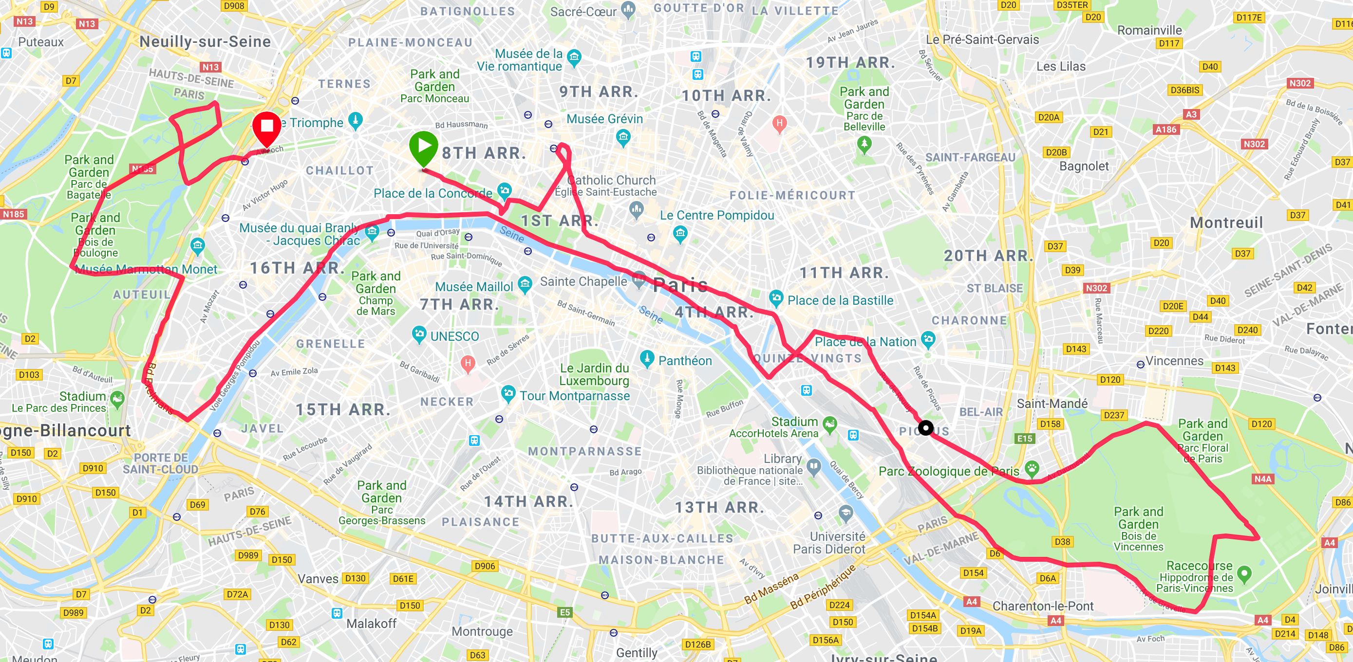 The crowds were patchy but ok at times and I was running reasonably comfortably at roughly 4min/km for the first hour, which is my normal target marathon pace (until things collapse…). When you reached the Bois de Vincennes, the crowd obviously disappeared but I certainly gained strength from knowing that the 15km marker would be the furthest geographical point from the finish line: from there onwards, I was running “home”.  None of the mental torture from courses which take you to within a few meters of the finish line before swooping you away for another 5km (like in Florence…)