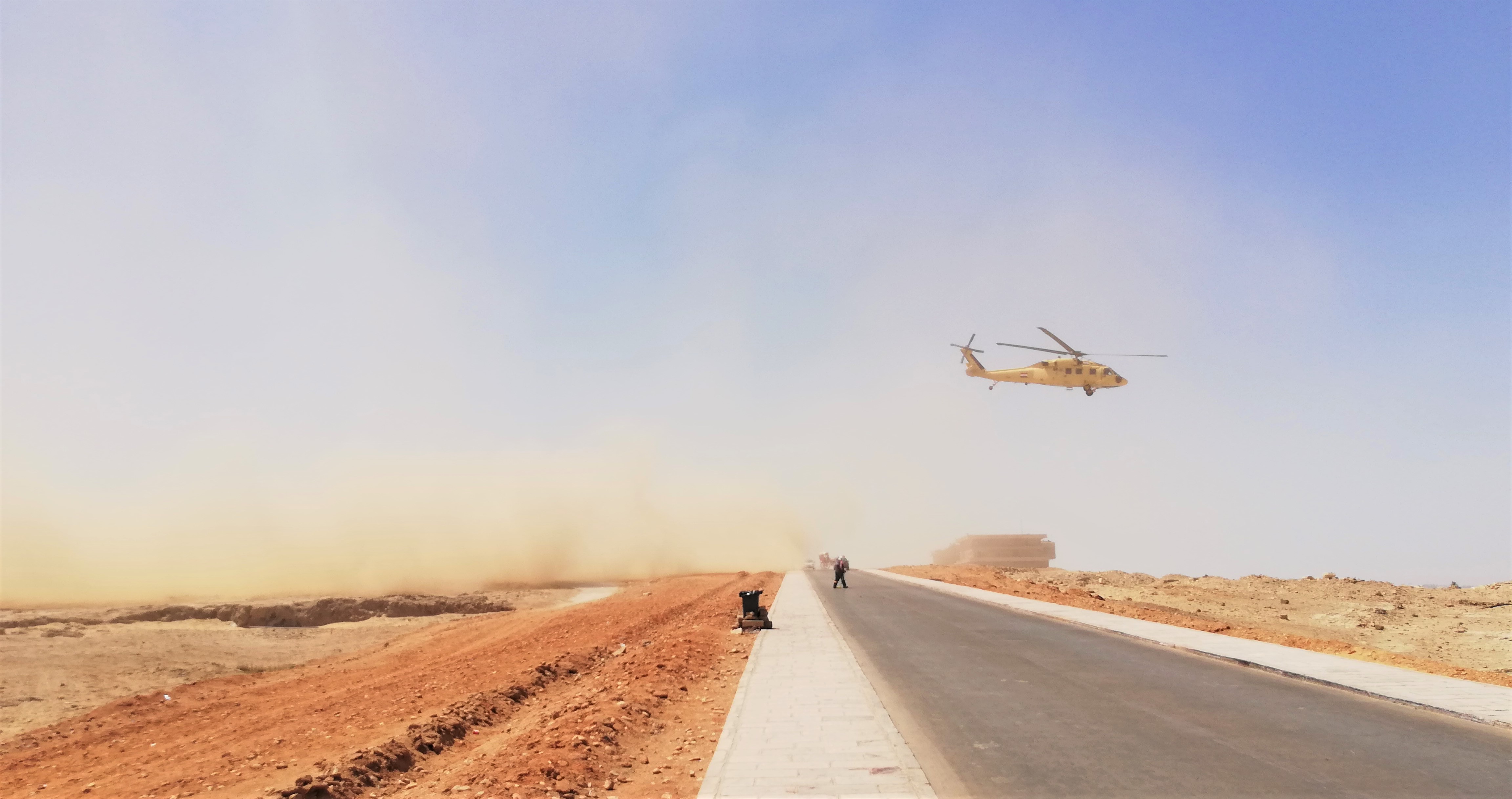 By this point, we’d been walking around the pyramids for a few hours and were at the lowest point of the site, near the Sphinx. I left my bag with an increasingly dehydrated Pippa and my colleague Emmeline and ran up the causeway towards the pyramid of Khafre (the one with the little hat on top). A full 80m of climb over the first kilometre on sand and rock under the pounding 30C sun almost gave me a heart attack but I kept going up towards the viewpoints a kilometre or so further away from the pyramids, though I did have to stop at one point to shield myself from a sand cloud caused by a … landing helicopter!