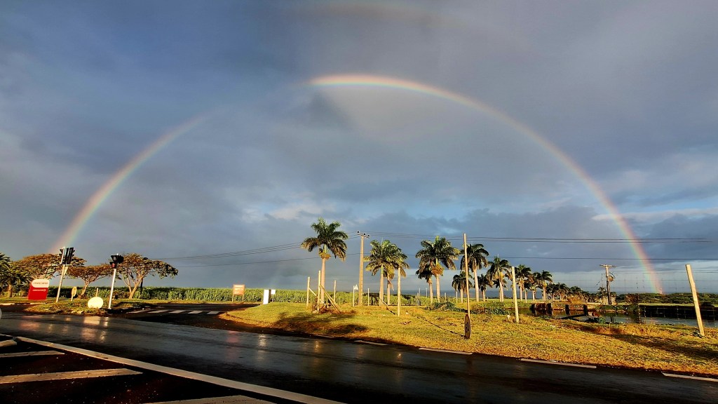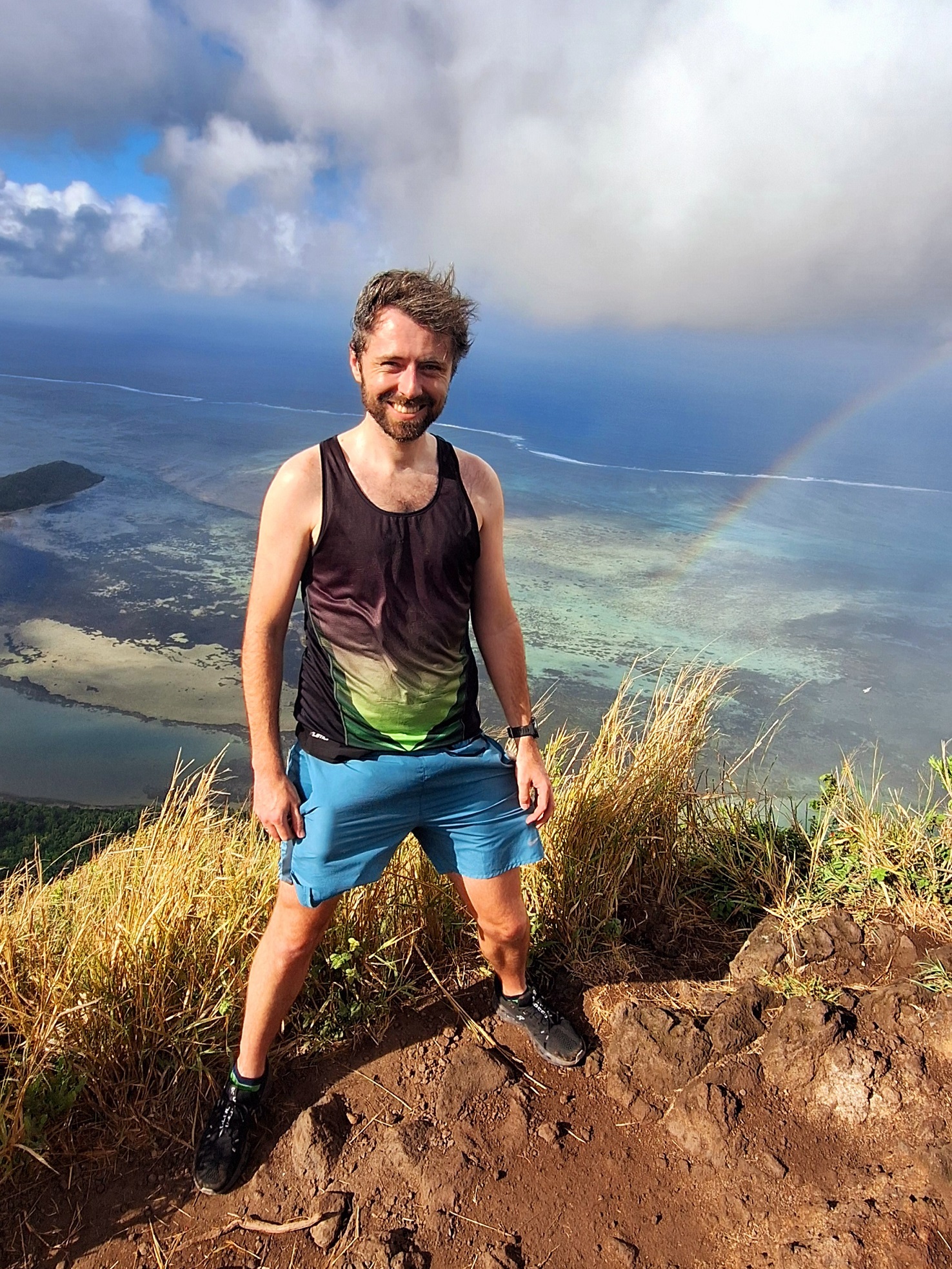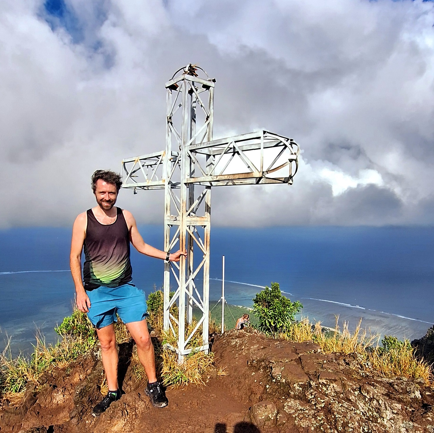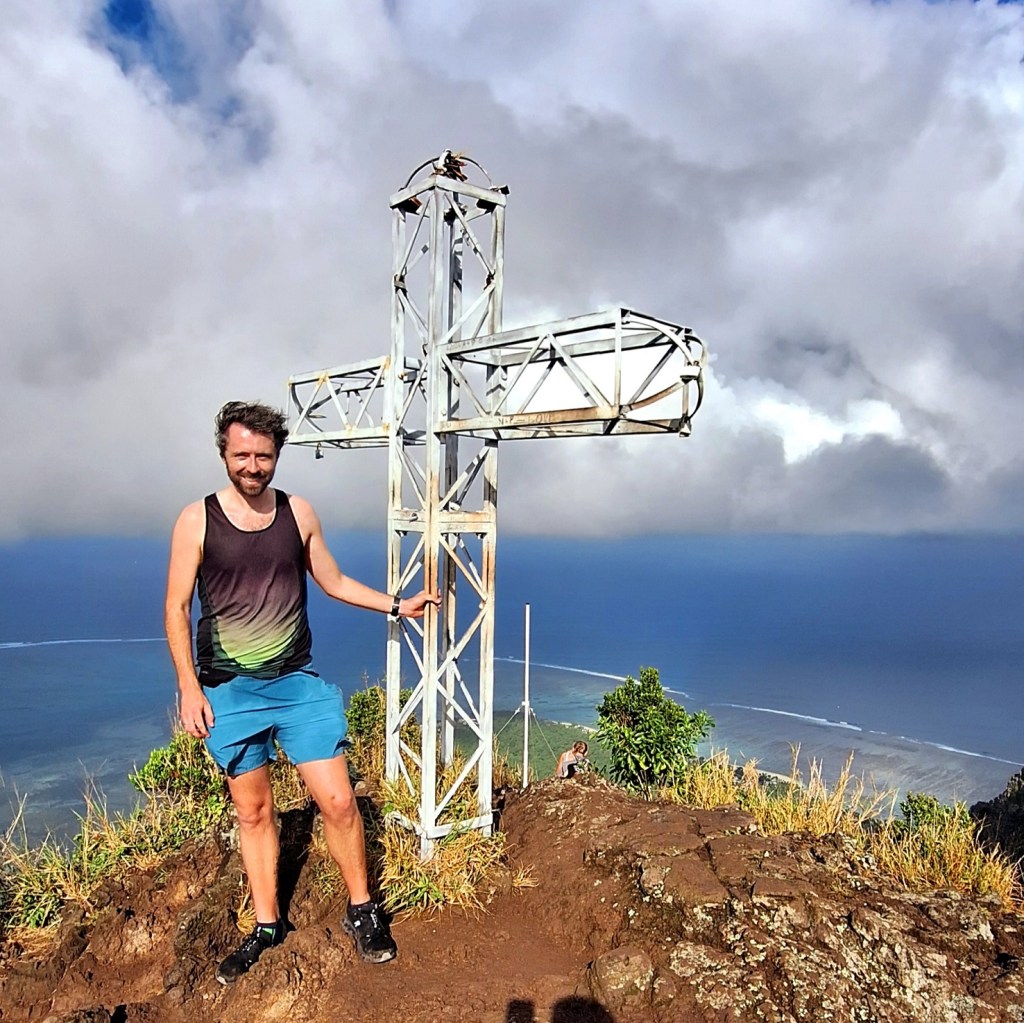 From the top and after I’d managed to smack the top of my head on the giant cross that marks the spot (ow), you get a 270° view of the ocean and its turquoise waters, the island and its yellow beaches and dramatic mountains and, cherry on the top, I even got a rainbow too!