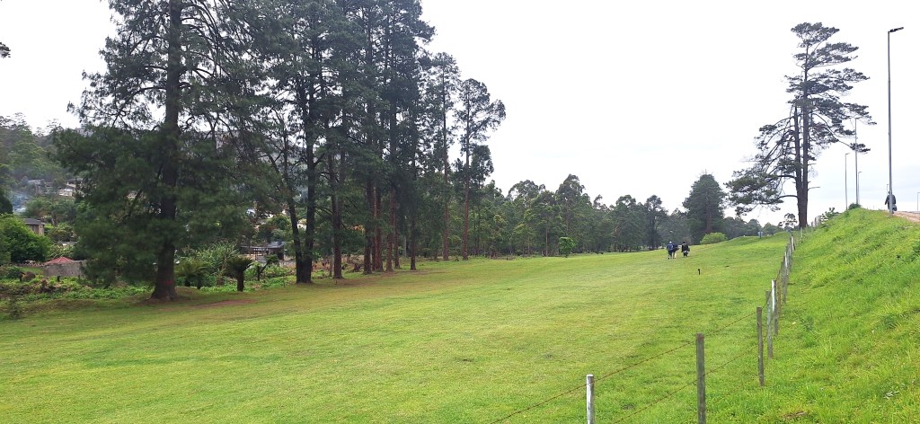 The first kilometre is flat and despite my prior whinging, pretty easy: after a few hundred meters navigating the alleys between sports pitches/car parks, you hit a shaded flat part of the golf course and carry on straight until you pop down to the stream, head into a (very dark!) tunnel under a main road and pop out the other side into the “main” section of the Golf course.